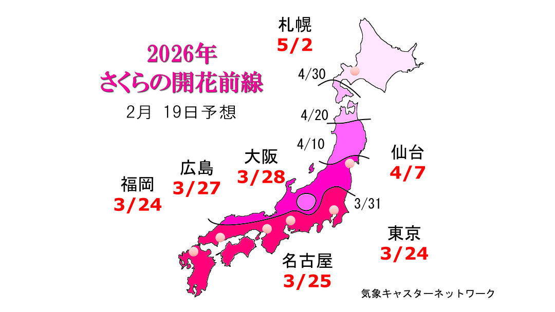 今年のさくらの開花は、平年並みの所が多いでしょう。昨年に比べると、西日本・東日本は同じくらい、北日本は遅くなるでしょう。(2月12日 更新)