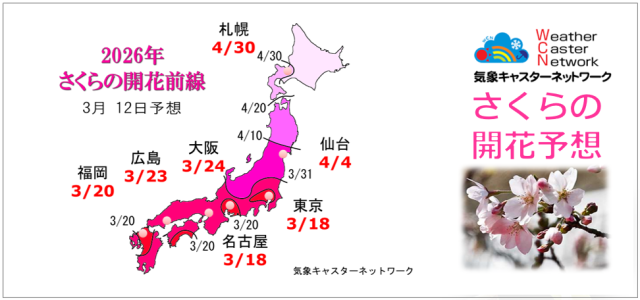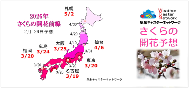 今年のさくらの開花は、平年より早く咲く所が多いでしょう。昨年に比べても早く咲く所が多くなりそうです。(2月26日 更新)