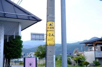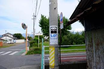 町のあちらこちらには浸水の深さを示す表示が。